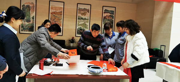 活动现场翰墨飘香,各位职工书法家倾情书写,有的奋笔疾书,有的笔走龙蛇,书法苍劲有力,清新俊美,一个个吉祥如意、潇洒飘逸的“福”字跃然纸上,春联内容既有辞旧迎新的美好愿景,也有宏图大展的励志词句。