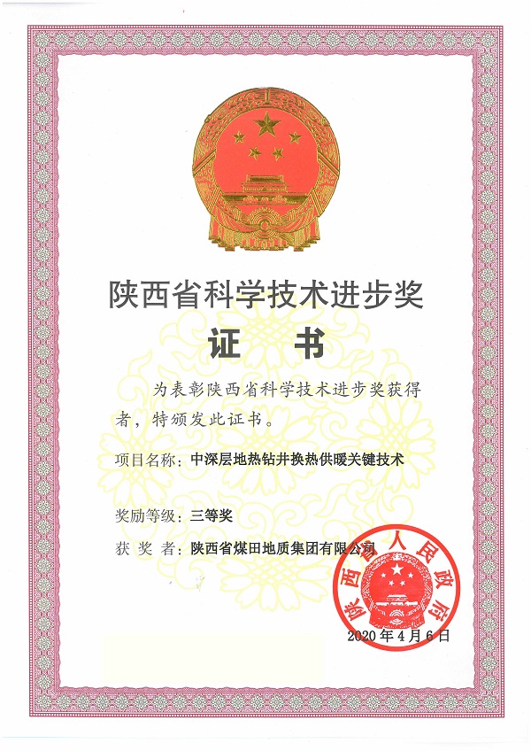 集团一地热科研成果荣获陕西省科学技术进步三等奖